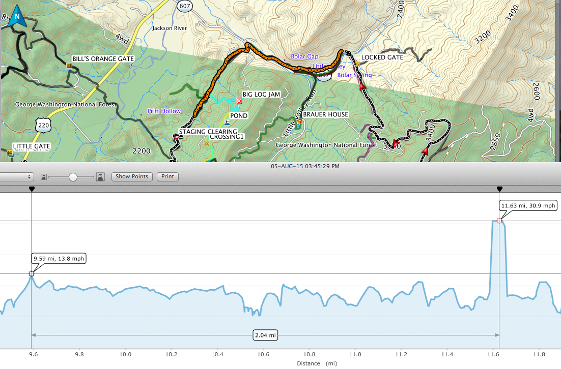 **She does like to canter, and even through I KNOW better, I let her a few times because it’s so fun. My graph says we had a short spurt of about 30 mph, but I’m not sure I believe it. That seems awful fast, but I remember that little canter and we were flying for a few seconds for sure. I can tell you it was faster that 15mph which is her fastest trot. Maybe she did hit 30 for a second – but from my experience clocking Faygo (who I’ve ridden in a fast canter around 25mph) I would guess it was closer to 20mph.