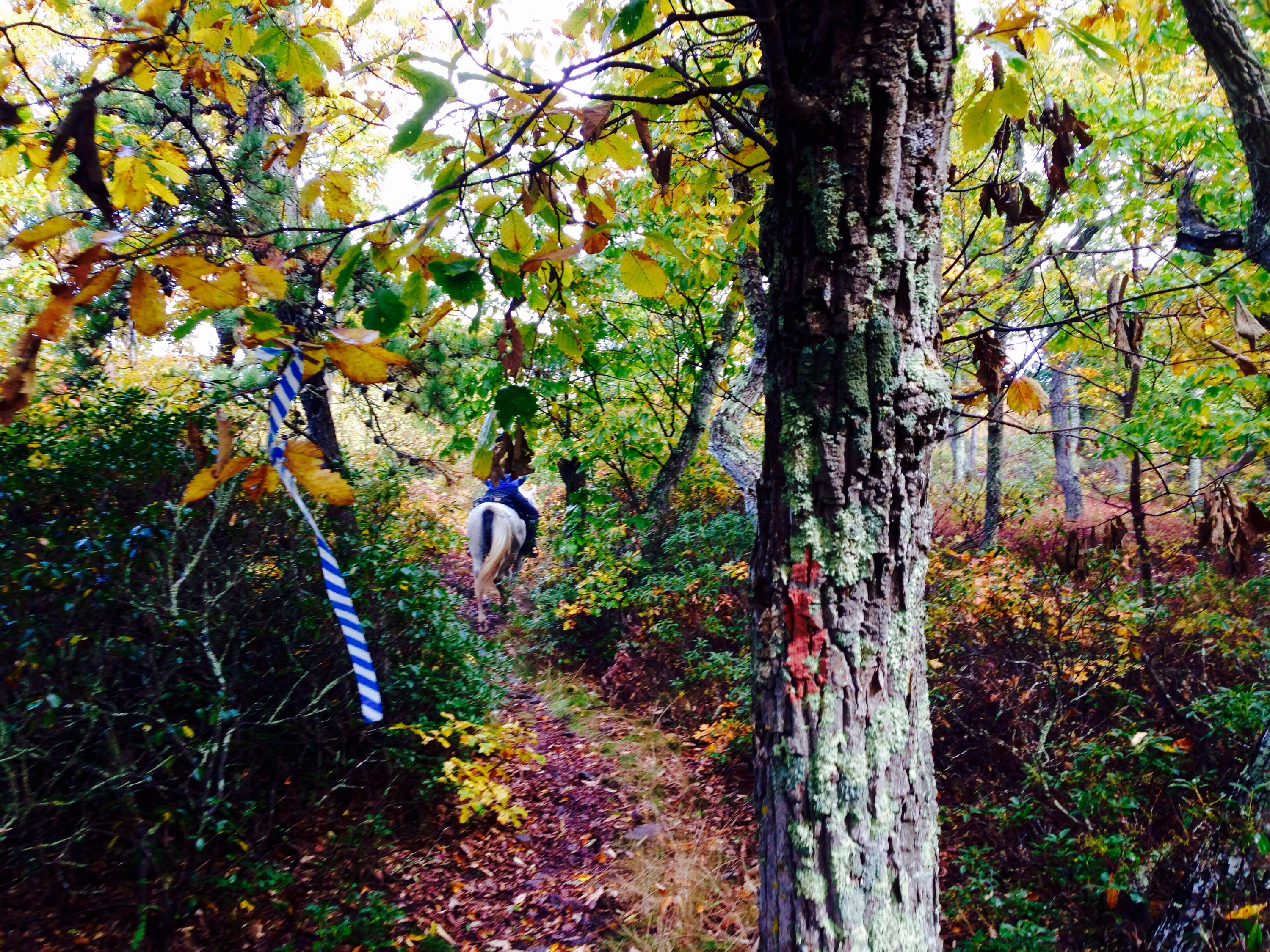 We made small talk and laughed and enjoyed the beautiful afternoon but there was a heavier feel to the final leg of our ride hanging over us. We talked about our horses, and how pretty fall was and anything else that came to mind. Eventually we came to a confusing turn. Well- it wasn’t exactly confusing, the red ribbons indicated a turn to the left. It was clear as it could be, but when we turned that way we saw a “W” sign on a tree that said “WRONG” underneath.