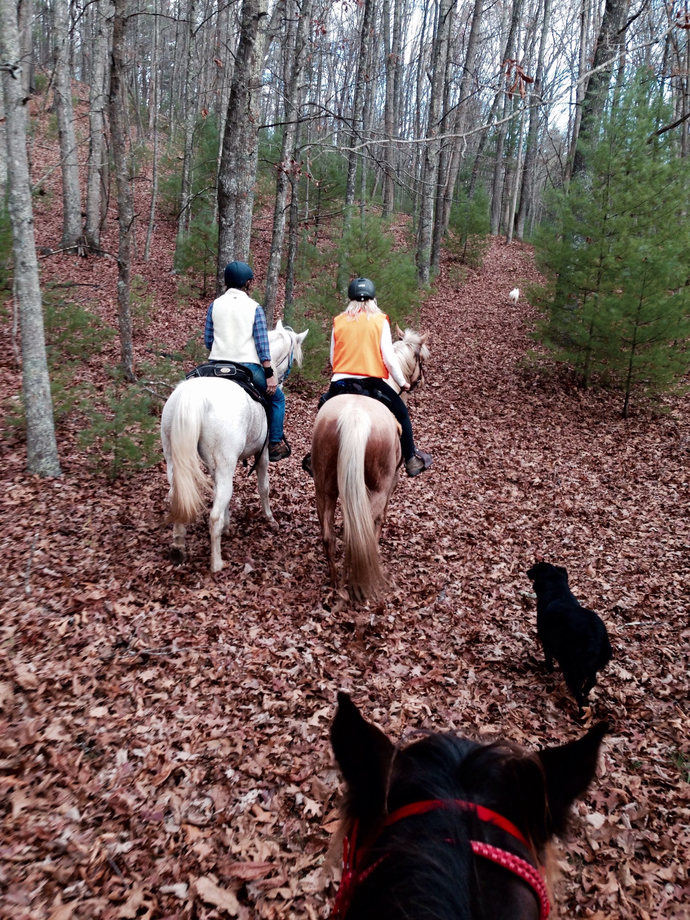 She had never crossed a river before (we did that twice- not including all the small streams we pass). Khaleesi and I opened almost all the gates and closed them without dismounting and she was quite impressed. We went off trail for a segment that I prefer where the trail is steep and often washed out and rode through the open woods “obstacle course.” We rode the horses through two sets of cows each having young bulls romping about without incident. We took the dogs along too (of course!). She thought the woods and trails were beautiful and said she’d never done anything like it before and fell in love. She promised to come back anytime she could!