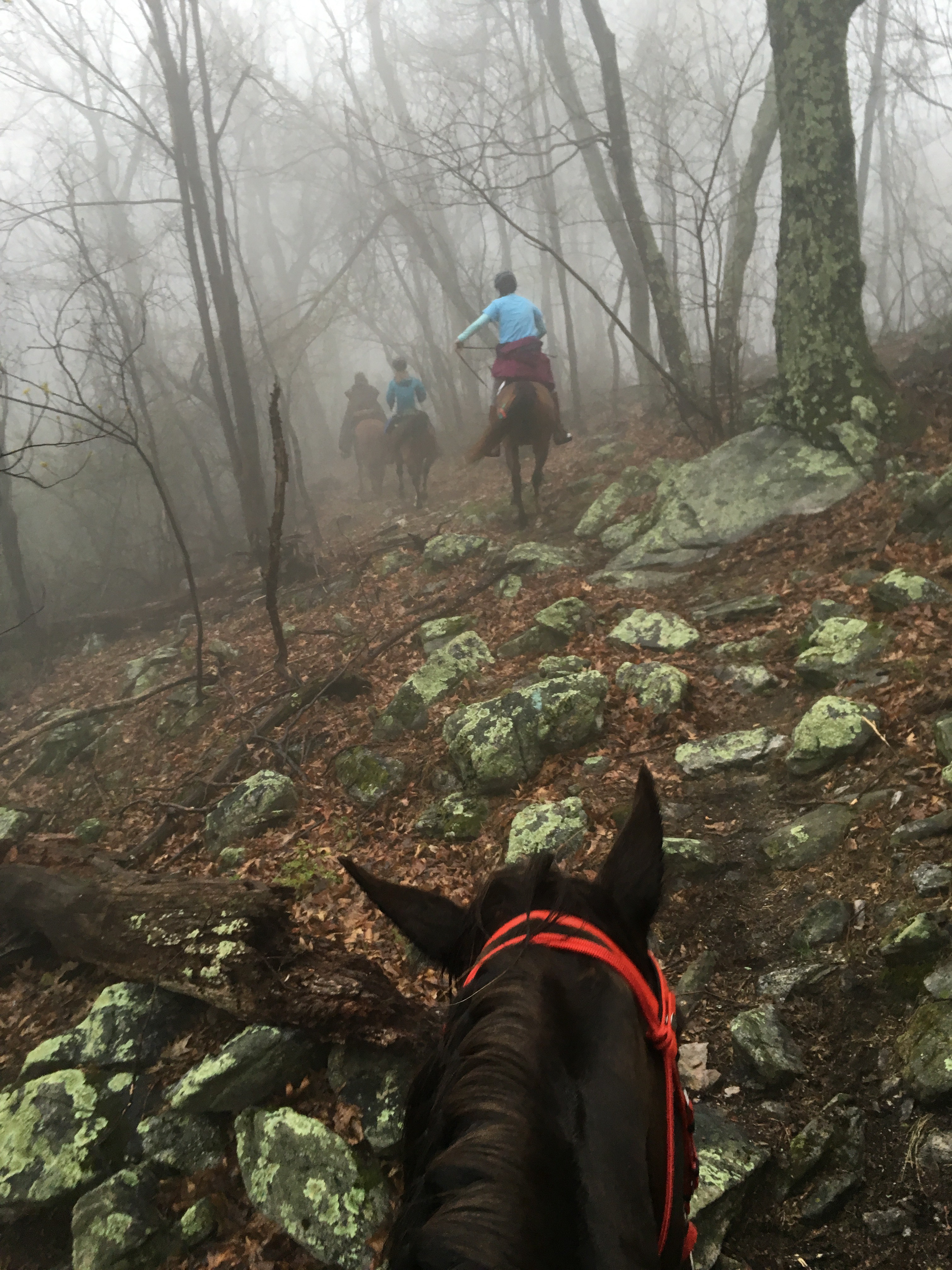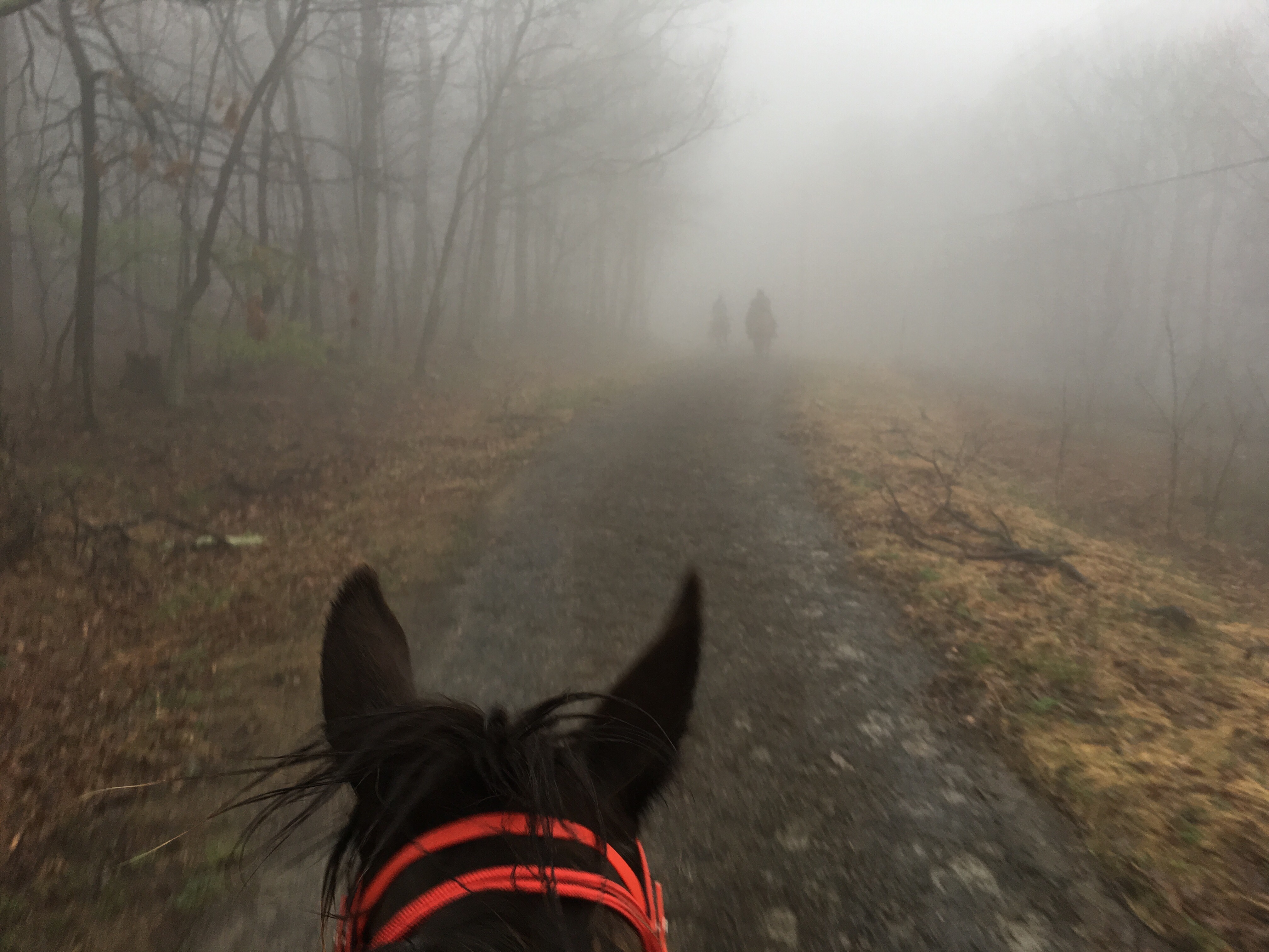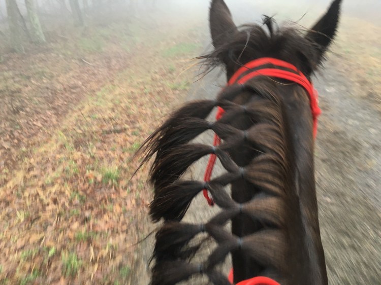 My very favorite part of the day was in the first hour when we were cantering up and down dirt ridge roads and you could hardly see in front of you – the riders were like shadows ahead. That was a neat moment for me – we were riding alone for a few minutes there and just us, a team of two.