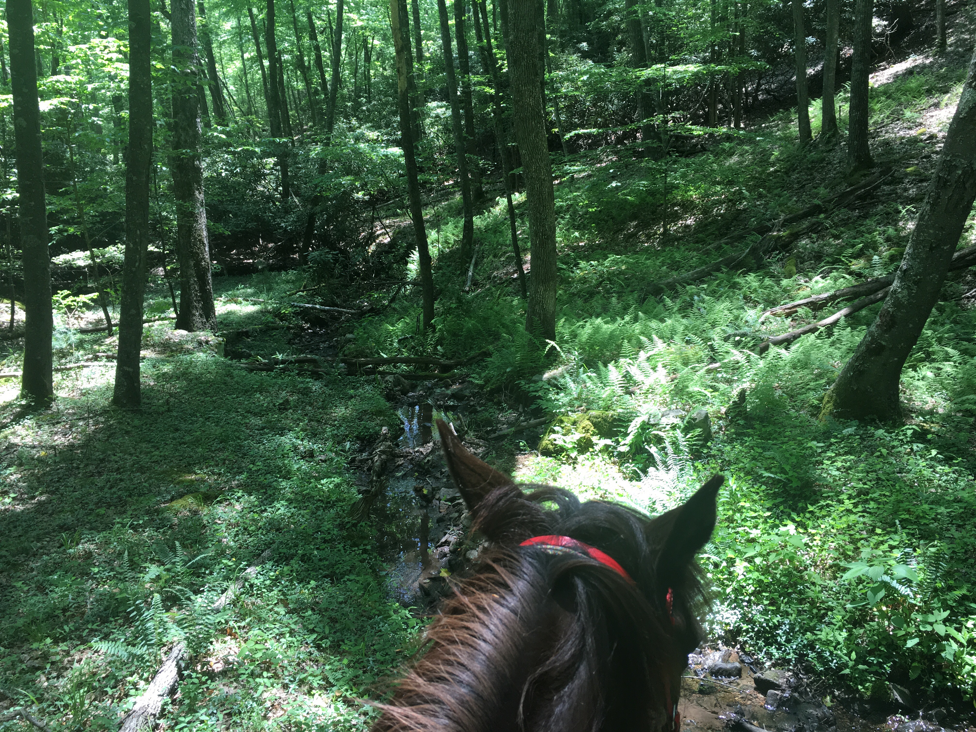 As we made our way through thickening laurel, rhododendron and the clipped maze of berry briars I thought how fortunate I have been to not have encounters anything in my years of riding alone in very low traffic areas that have put us in undue peril. At least I’d told someone the basic route we were taking and was wearing my bright fushia spf cooling shirt that Ed gave me for my birthday last year.