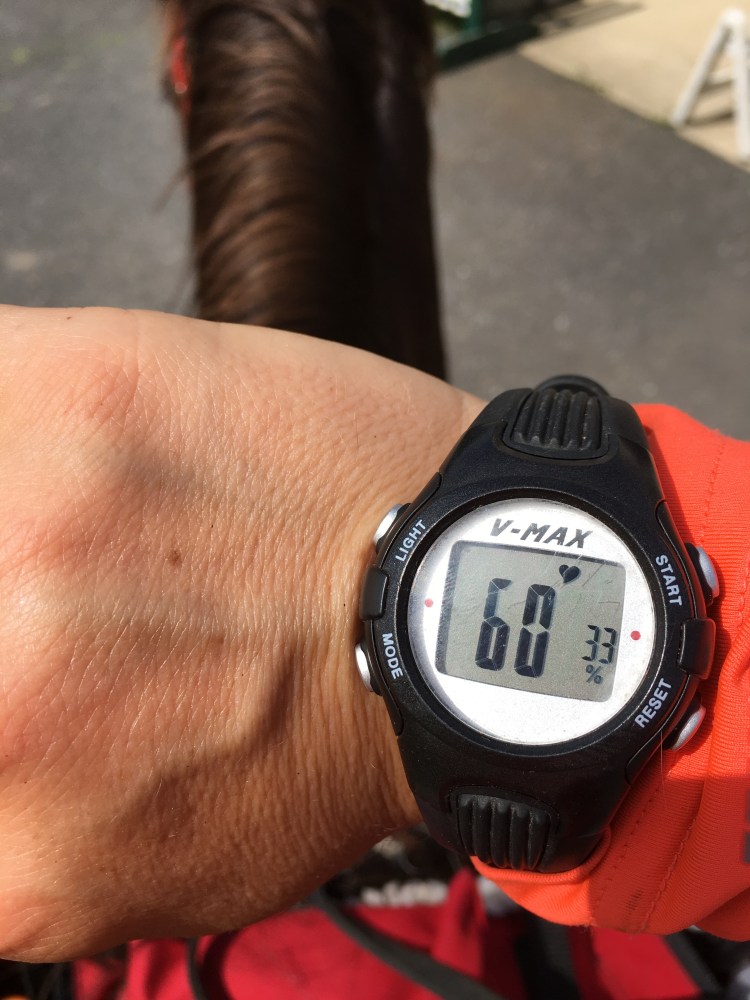 Some of the inclines are insanely steep- I ask for a power walk and at the top I stop and watch the HRM to see how she’s recovering.  It’s over 80F and humid and I am happy with what I’m seeing she’s back to 64 in less than a minute each time: