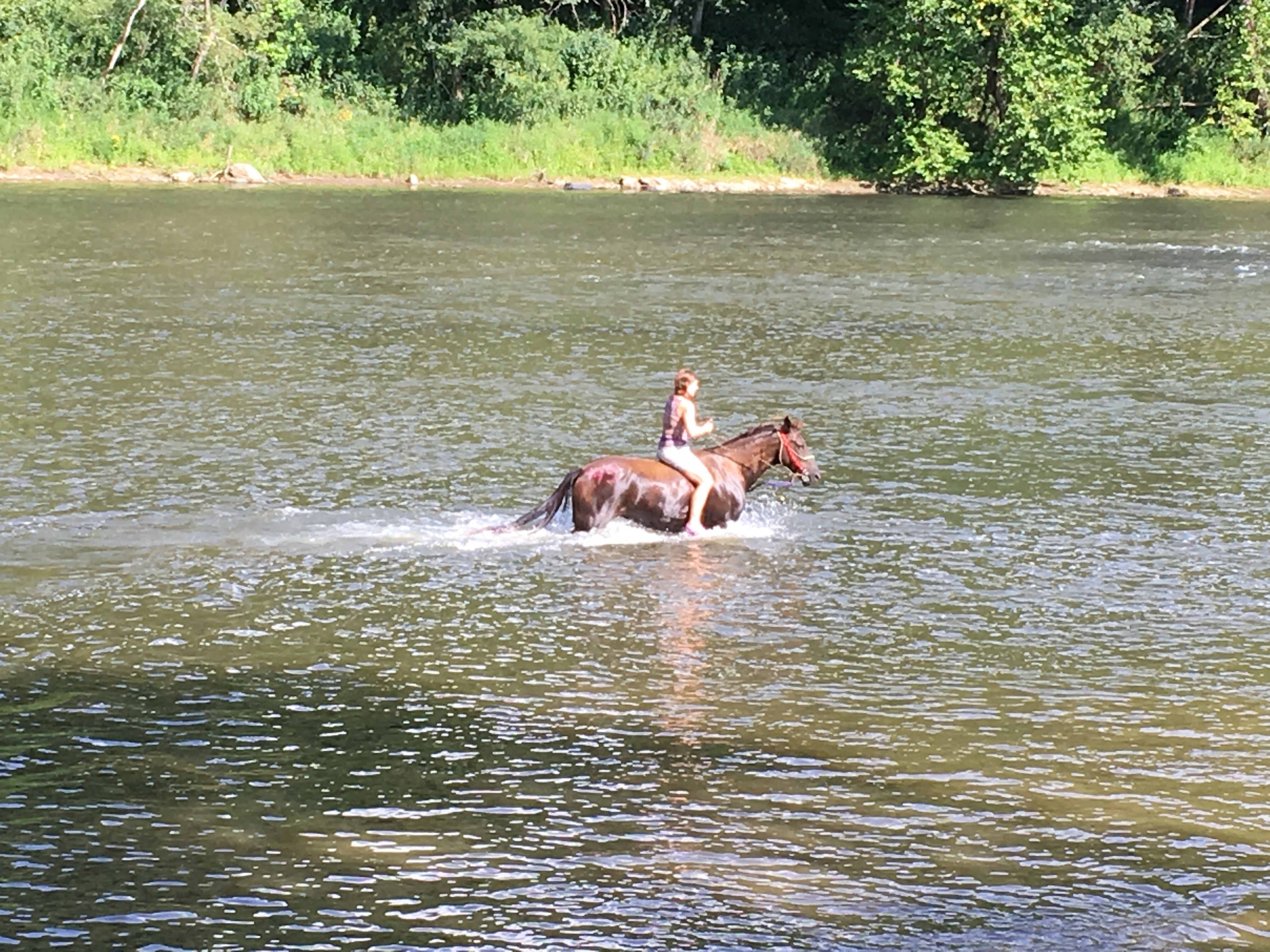 I hopped on bareback and could hardly keep her from beelining down to the water. She immediately stopped in the shallows and I knew she wanted to lay down but I kicked her forward. I wanted to get deeper. She complied but when we got in up deeper than her belly she would trot hop which could have been due to the mucky bottom I’m not sure, but it wasn’t quite deep enough for swimming yet.