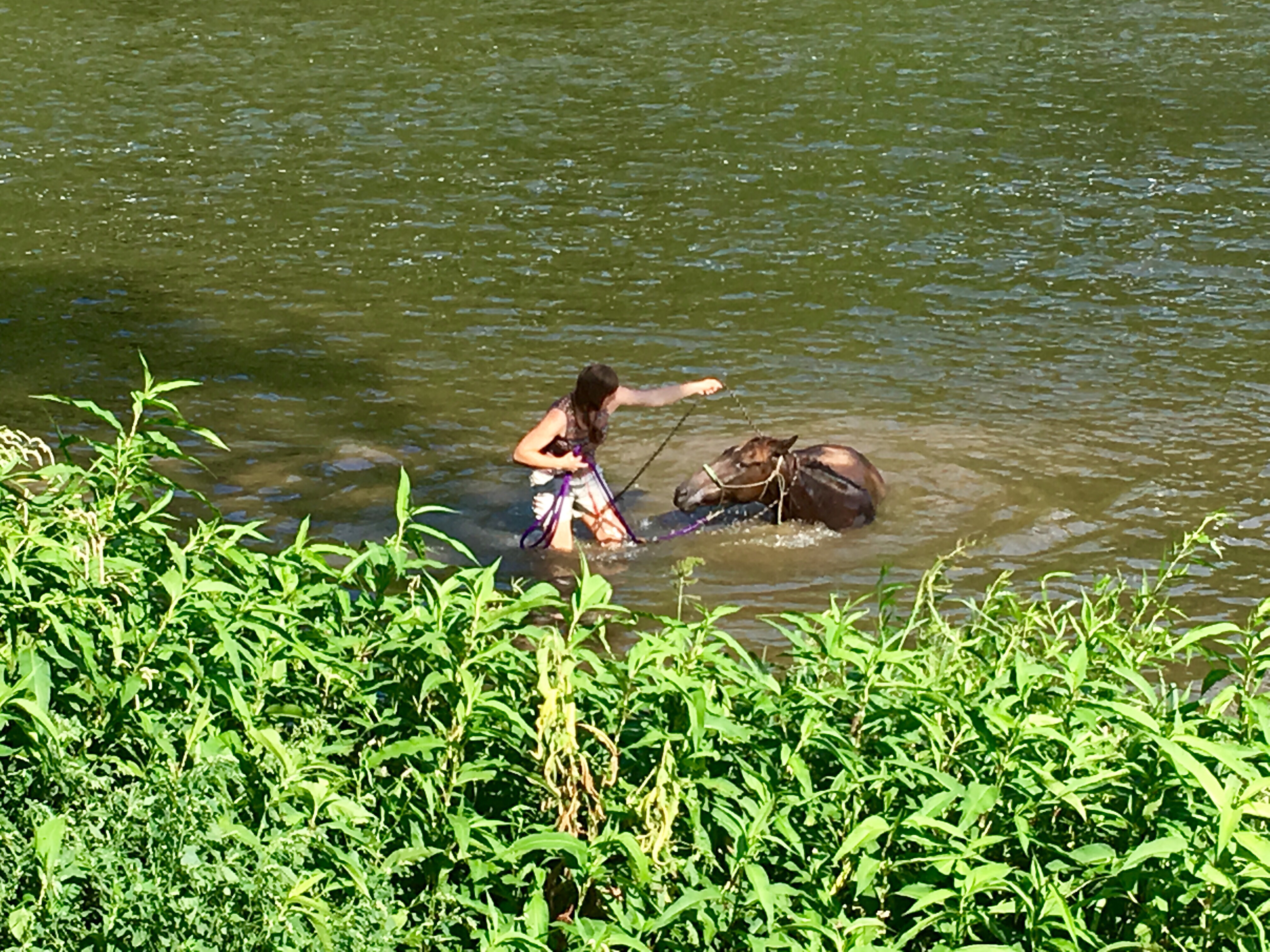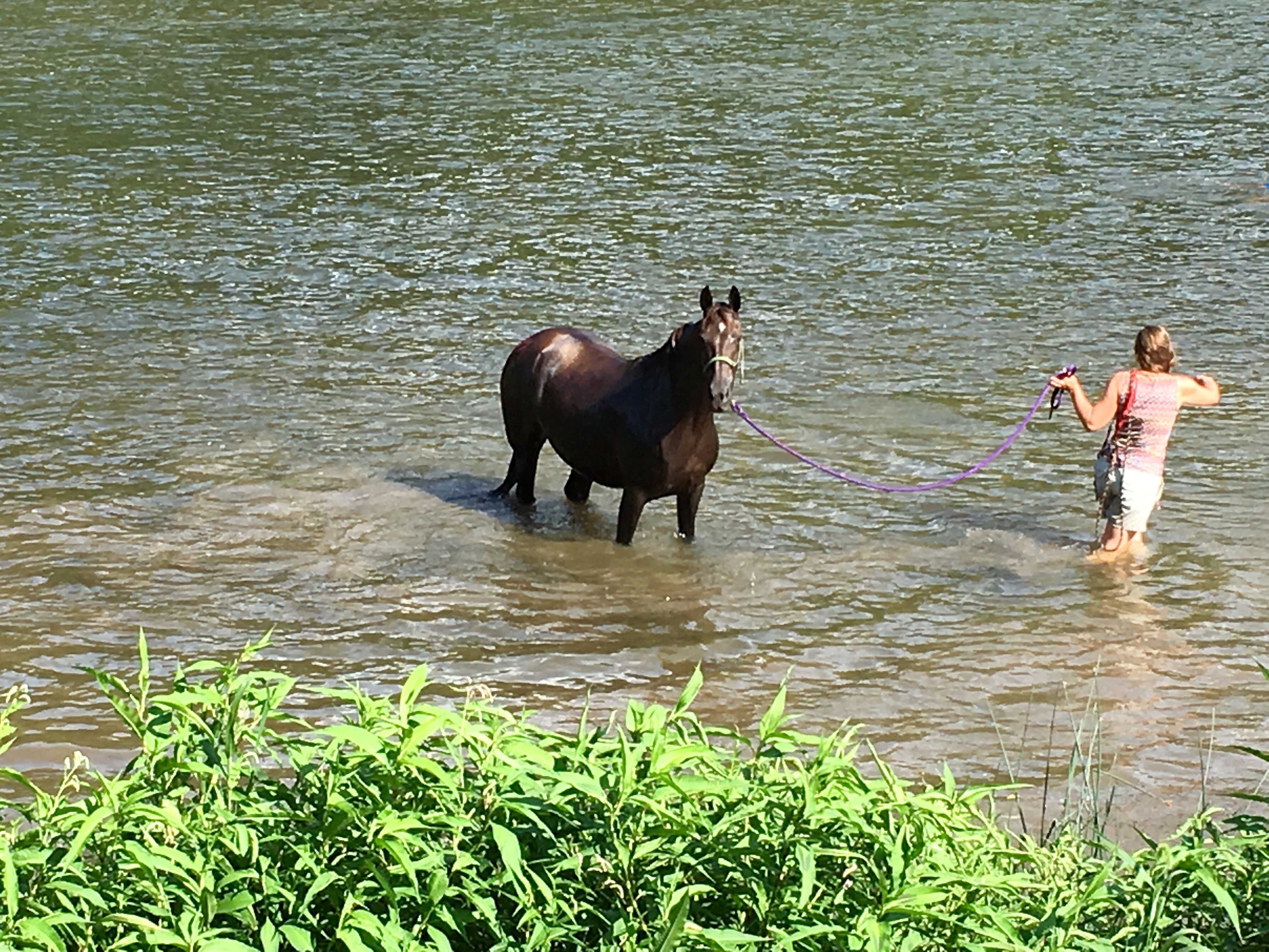 As we waded around in the New River she must have laid down 20 more times in the soft mucky sand- to the entertainment of the other horse owners who had normal well behaved horses that stood quietly in the water. Apparently I had a sea serpent.