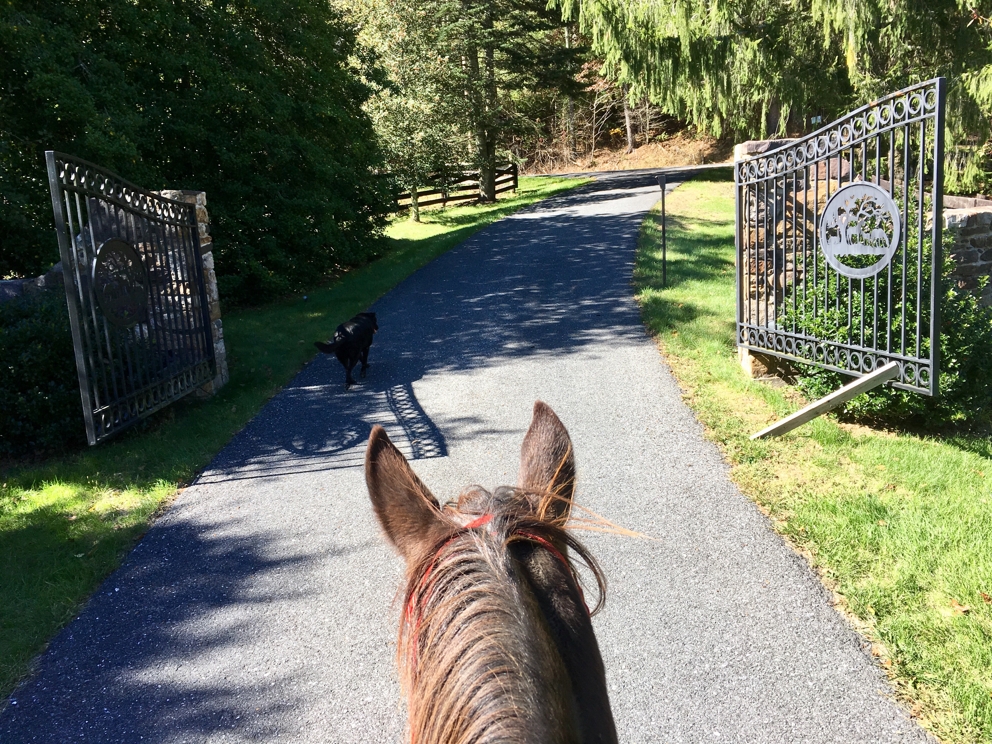 Then the property exit: we are walking right off the property- through the gates on my chosen path with steady walk tempo. My focus completely on the road ahead. Ears forward and we had hardly a question.