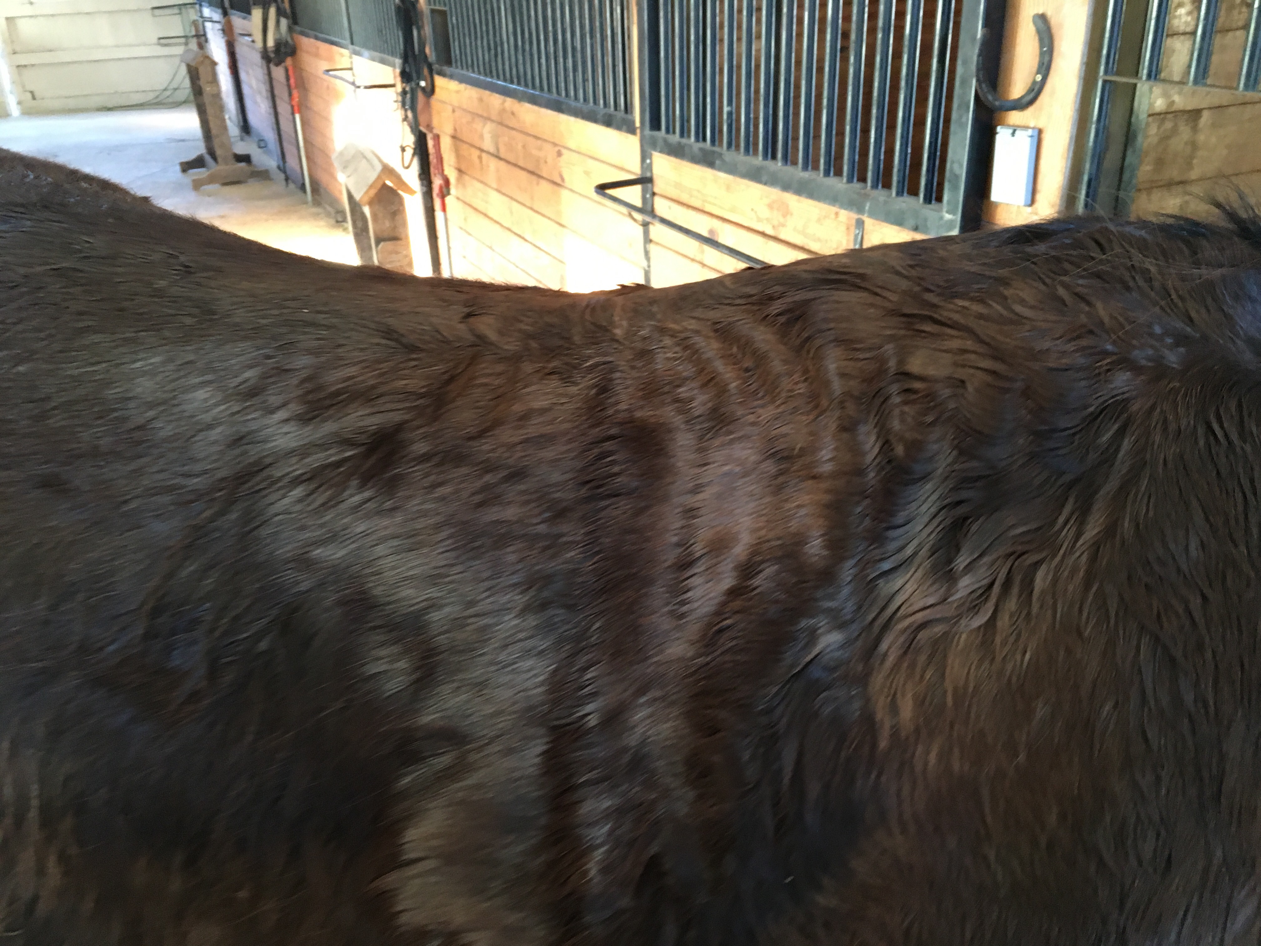 No dry spots. (It isn’t obvious with the coloring in the picture but to the touch all was wet) In fact the thinline created heat and the sweat came up through the cool back pad and the thinline had a layer of sweat. Her hair was wavy behind the withers and she was slightly sensitive in her loin area upon testing after the ride. The thinline covered too much area under the saddle in my opinion and didn’t work to only shim the lower spots.