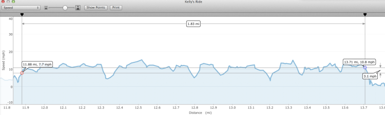 - Next leg: 2’14” for .4 mile at 11mph average elevation gain of 166 feet. Walked 23 seconds to recover.
