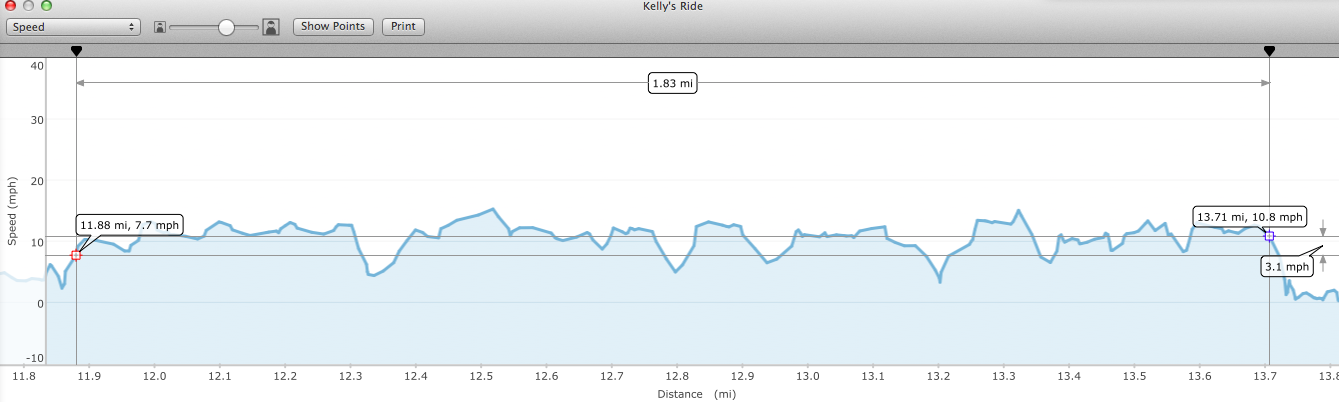 - Next leg: 2’14” for .4 mile at 11mph average elevation gain of 166 feet. Walked 23 seconds to recover.
