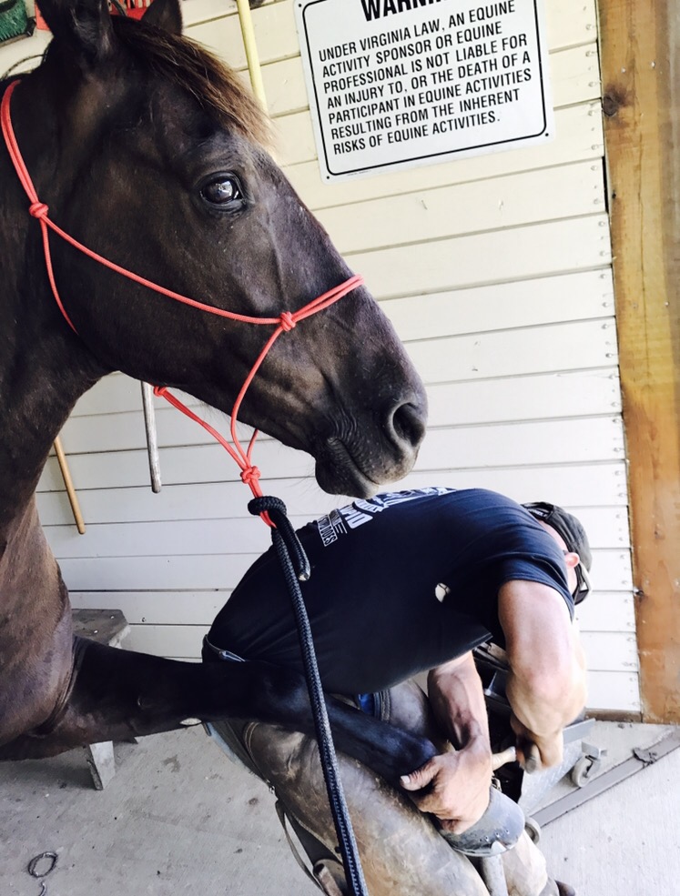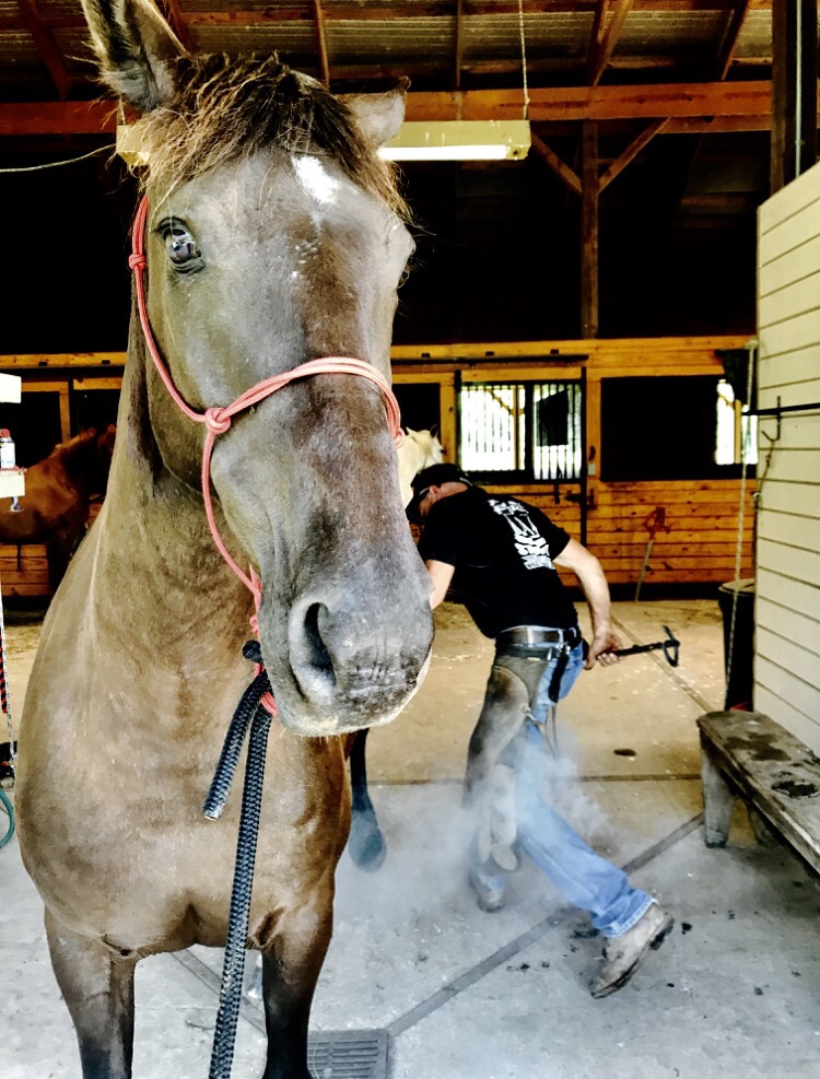 She handled the hot shoeing with minimal fretting. And she stood much more still while he nailed than usual. I’ve watched and the initial easy beats to set the nail she’s fine- it’s the energy to really drive them in at the end that sends her wanting to pull those feet back but for the most part she trusted me that this was important and I was able to assure her before she tried to pull out… mostly