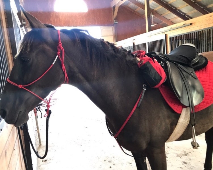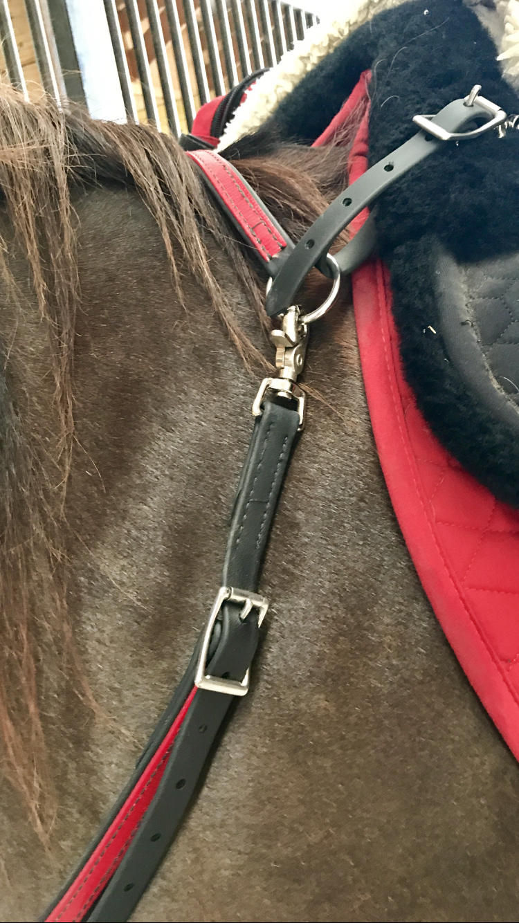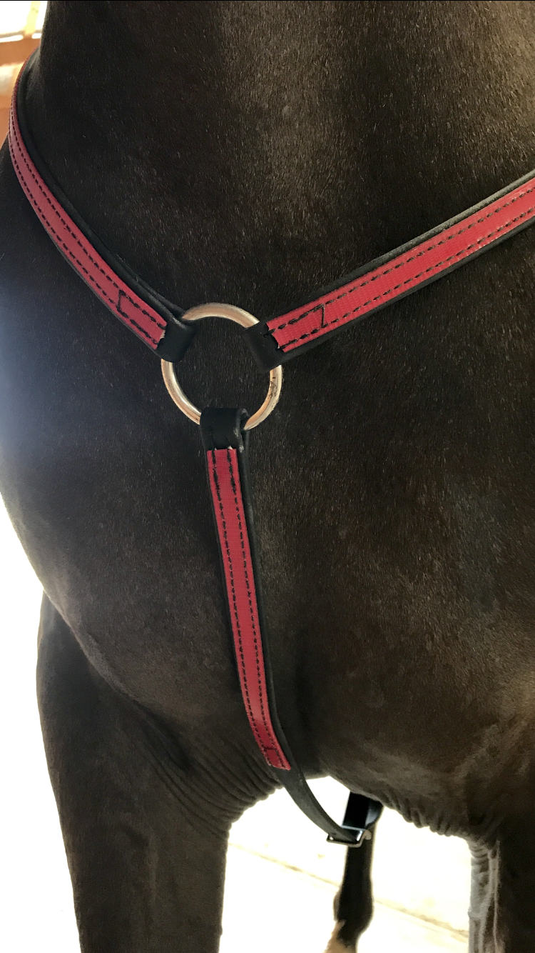 Along with the saddle I needed a new breastplate. My other is western style and isn’t long enough. Two-Horse Tack sent me a really nice red on black biothane one to review and I really like it.