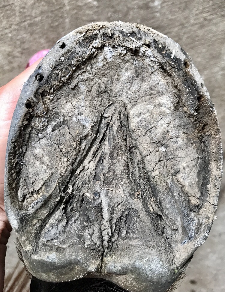 The rear hoof just after the pad and shoe removed. The quality of the underside of the hoof is not at all like the fronts.