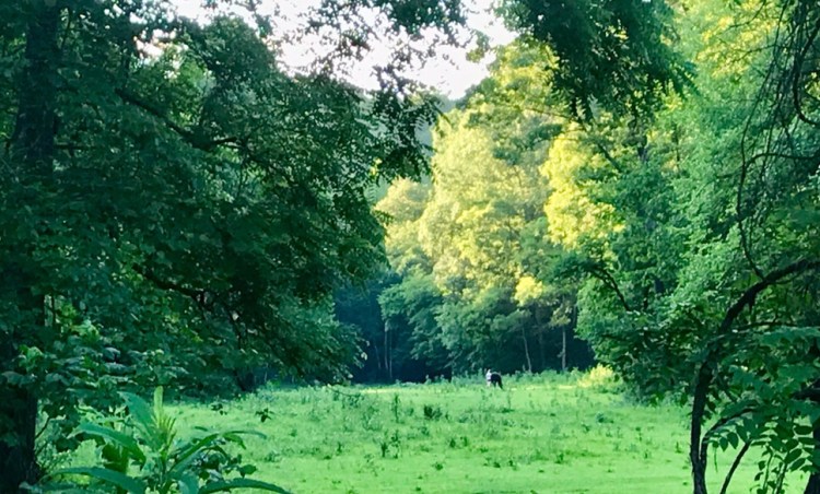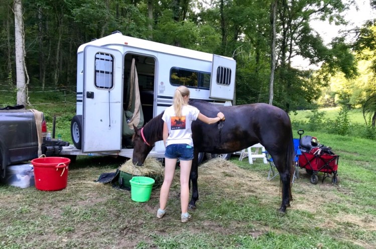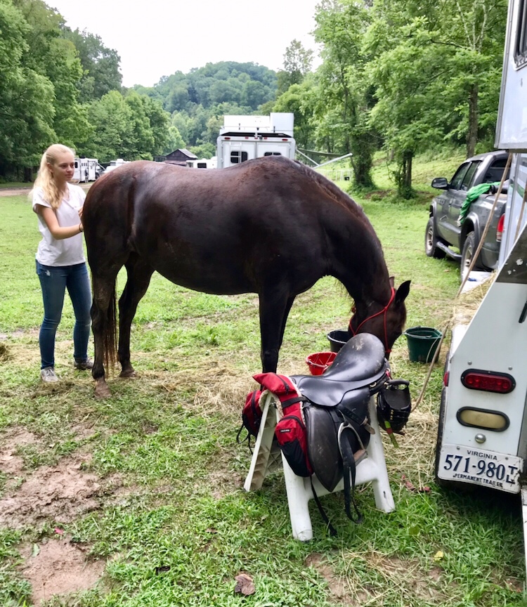 The queen had returned to her normal self and began ravaging the grass as Iva walked her once more around the pretty field right across the stream from us. We were the farthest from the vet check area, but the flip side was we had the nicest spot in camp at the very end where the stream came down and a pretty meadow for hand grazing directly across.