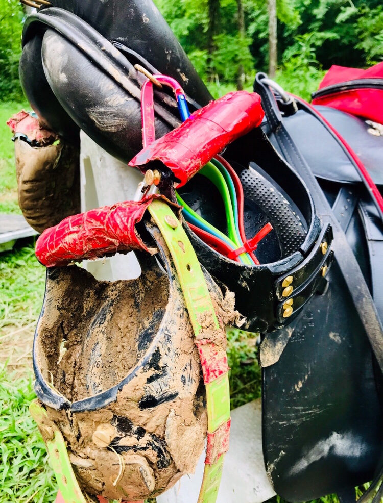 I got off, grabbed the boot out of the mud suck, removed the other front and clipped the muck balls onto my saddle. My raincoat was covered in mud from trying to wipe my hands all morning on something and I hand jogged her the final 1/2 mile into camp.
