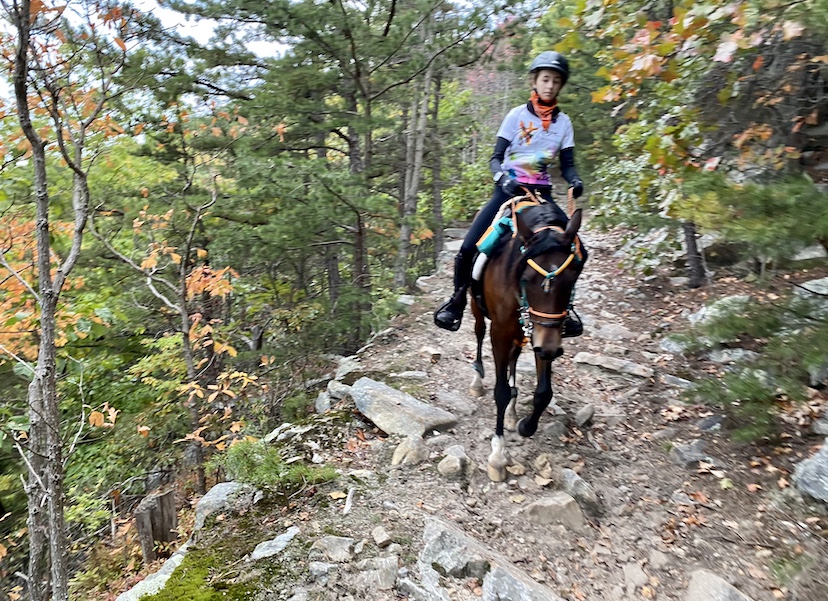 Fort Valley is an Old Dominion ride, and so it is one of the more challenging East Coast rides boasting rocky trails, lots of climbs- very few flat grassy roads, but also is beautiful and held at a time the trees are changing to brilliant golds and reds. Part of the ride is along the Shenandoah River. This ride heads out of camp (which is in a valley) up the ridge for two out of the three loops and includes the segments I call “Tread-Mill-ford” Lane (the two mile relentless steep gravel road up the mountain), and the “Trail of Tears” which is the other side of the ridge that is rocky and steep and it’s not easy going up or down it. This ride demands climbing and descending that mountain twice to get to the trails in the next valley over with lots of technical maneuvering for the horse, and none of that is fast. To survive these rides one MUST take any opportunity to move along and get moving.