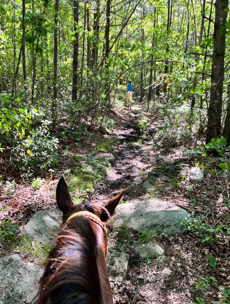 Afterwords we began to navigate the technical terrain with annoyance but faster than the little family and drag rider so we moved on ahead. When we got to the downhill segment she began to try to move but did not like sliding out- she has a good head on her shoulders and is not inclined to race ahead of her ability to not sustain injury. She she’d trot a few steps then slow and slip then trot a few steps then slip and slow. So I got back off and began to run down the hill. We had practiced this at home a fair amount. With me not on her she began running down the trail right behind me and I was going as fast as I could on my own two feet. It was working much better!