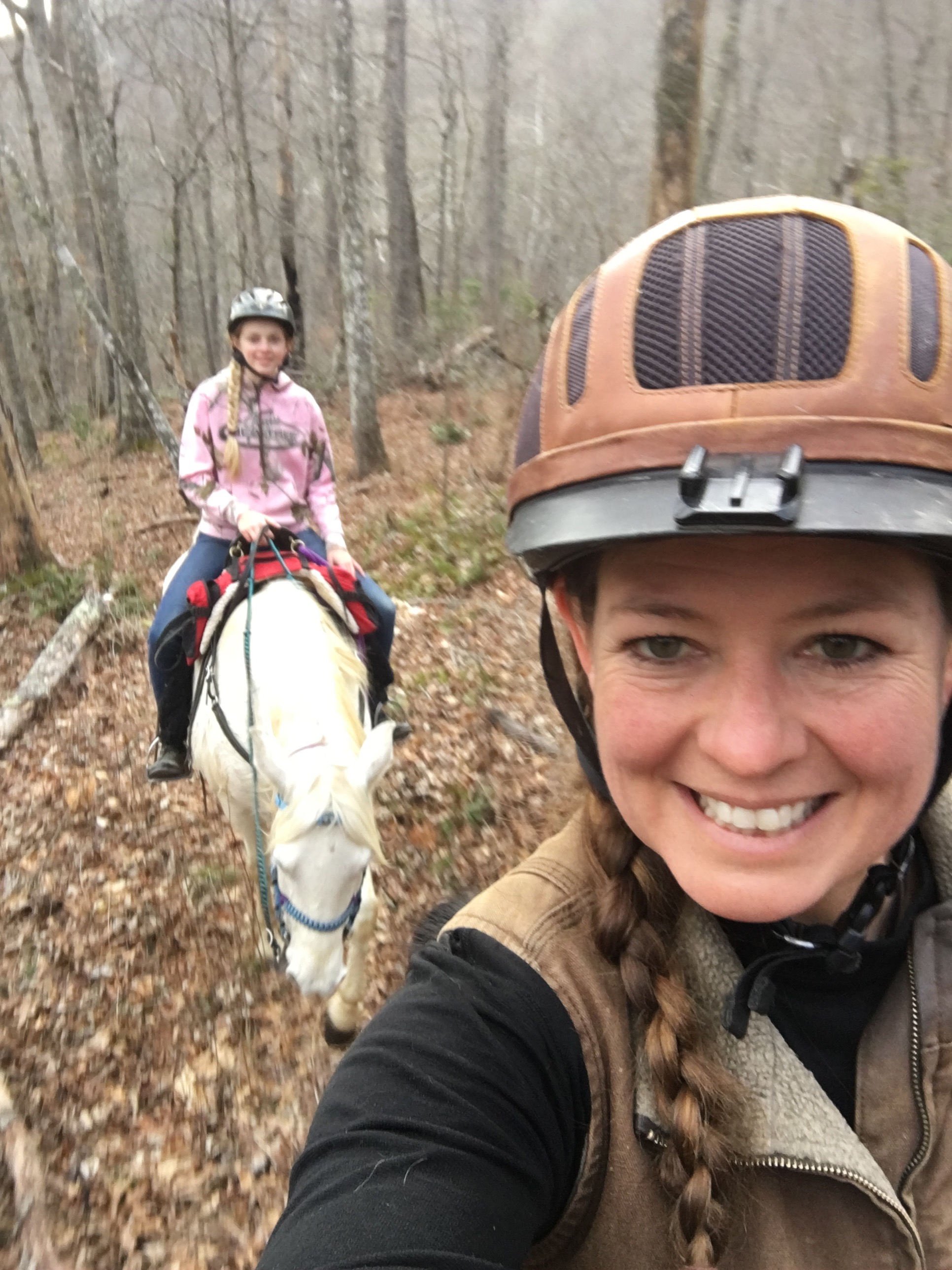 As we got our rhythm Elyse’s horse took lead on the field sections as she loved to canter on and we got sent into the single tracks first where Khaleesi was all business cutting her way around and through like a pro. One section was not so easy to follow the ground and you really had to watch for the ribbons and I swear that mare started looking for them on her own as we trotted through the woods. That was fun for both of us. I think she gets bored with the open field running.