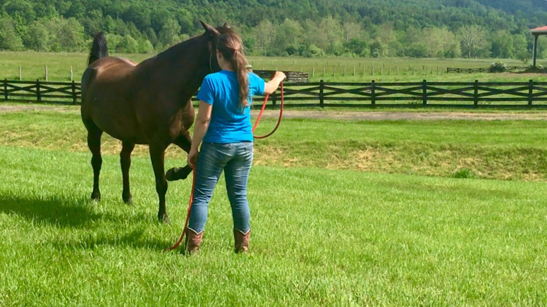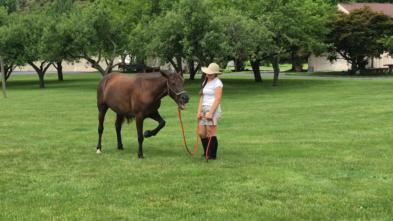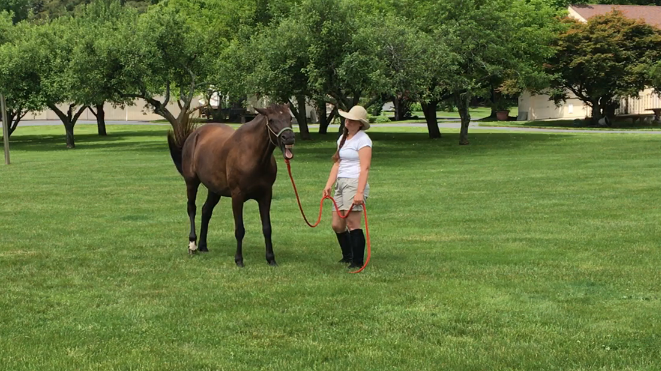 I’m speaking to Pam and Khaleesi’s job is to stand quietly and not eat. There are times she can eat and times I ask her not to. We have consistency in this communication- she can ask to eat and I will pop the rope (lightly) to say not now. She takes a bite of grass. I pop her with the lead “don’t eat”. We continue talking then eventually repeat eat-pop. A minute later same: eat-pop. That’s 3. She’s blowing me off so the next pop needs to mean something POP!!!!! She looks at me “ok I won’t eat.” Done. She stood quietly until we were finished.