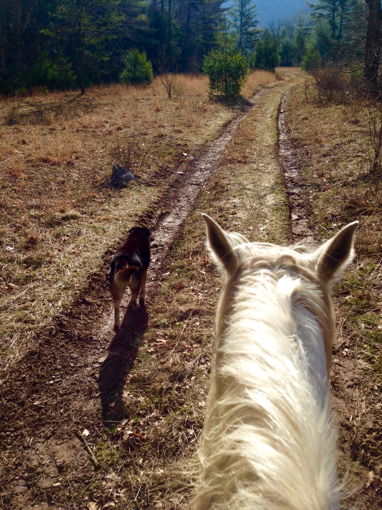 Sunday I thought I would do a short(ish) fast moving ride and I let the dogs come along. I don’t have the mileage mapped over the mountain (this is the mountain East of the river) into Little Valley and back, I guessed it would be a good 7 or 8 miles. The ride is steep to the top ridge trail, then it’s down or somewhat flat to come back through the valley so it was a nice ride to open up and work on some gaiting.