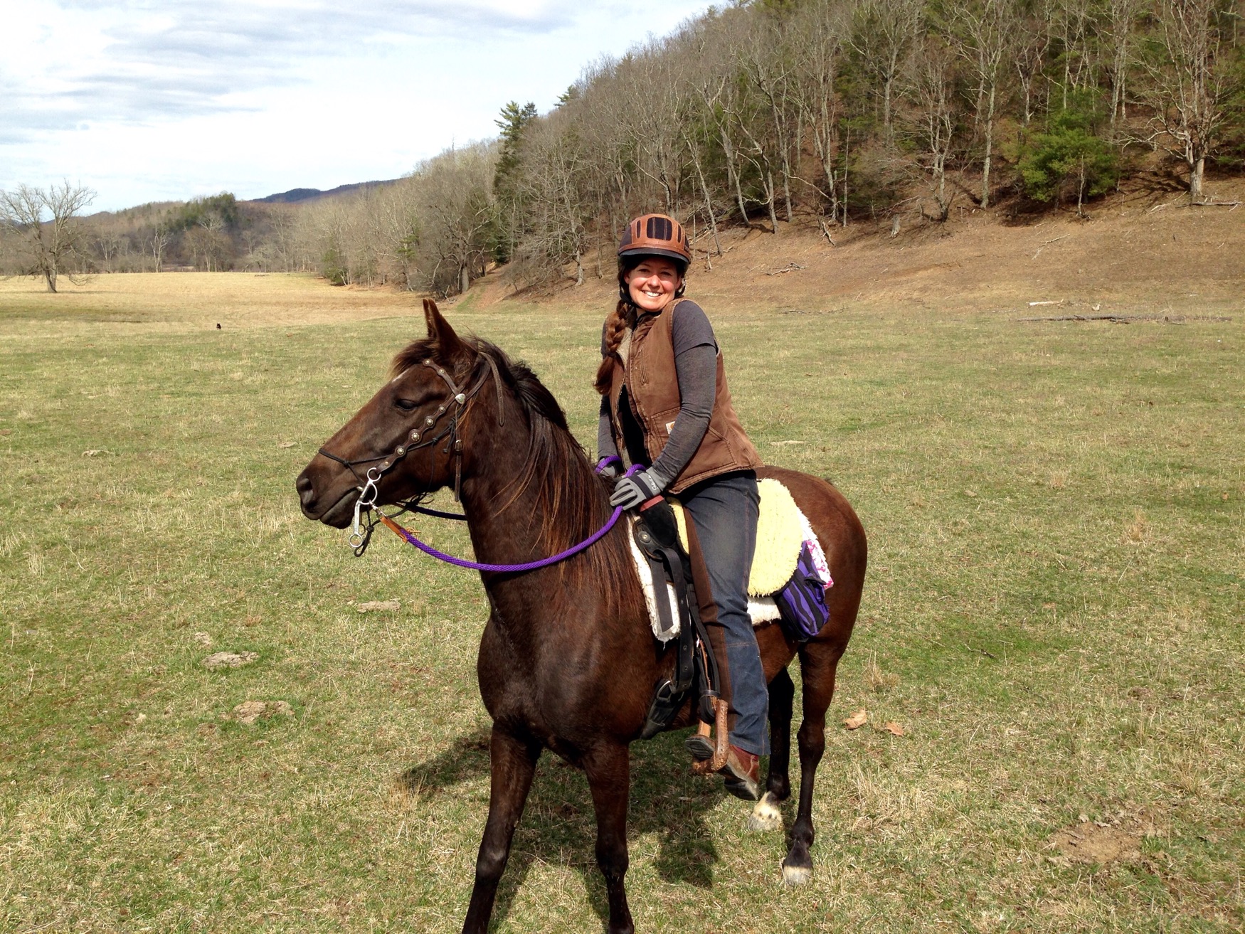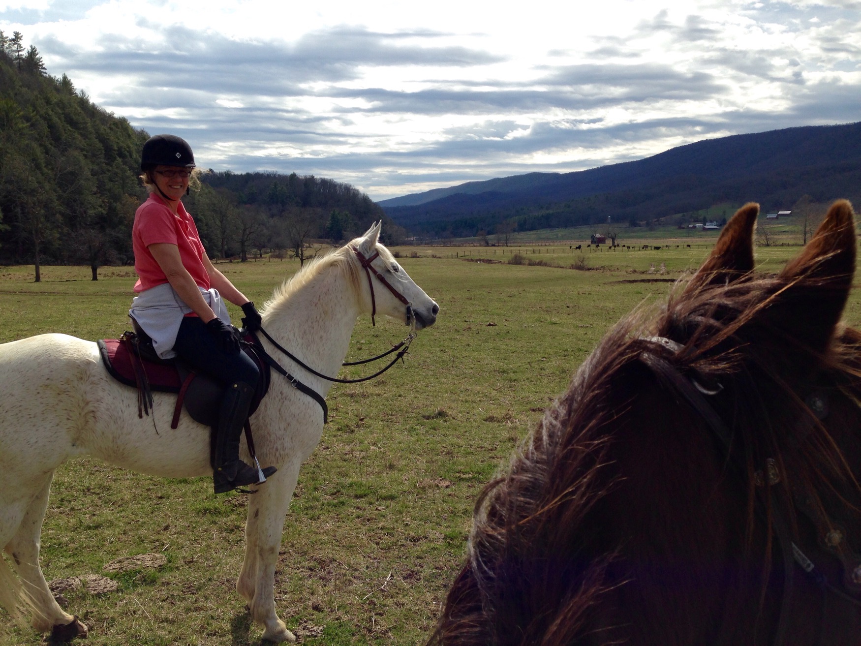 Our loop took us by a beautiful spot in the Jackson River Valley with a gorgeous view. It was a beautiful day as well and was a wonderful ride. I’ve decided that though we’ll still do some arena work, I’d like to focus on “training on the trail” with this horse as it’s more interesting for me, and will be really good for her since that will be her job (endurance trail riding). I worked on trying to get her to take to the bit and possibly start to set her head, but on the “snaffle” rings I just didn’t feel like she was getting it. I decided the next step will be to add a curb chain and connect to the curb rings on the bit to add some poll (top of her head) pressure to see if that encourages her to begin to tuck her head and get “on” the bit more with somewhat a headset. Due to my inexperience we may have to resort to a martingale or professional help at some point, but for now we’re still experimenting and I’m ok with the process. I spent some time holding her back from the trot, sitting back on her and trying to get her to fast walk, but our signals aren’t quite clear yet, so we do a little of that, and yes- I do let her do some trotting too.