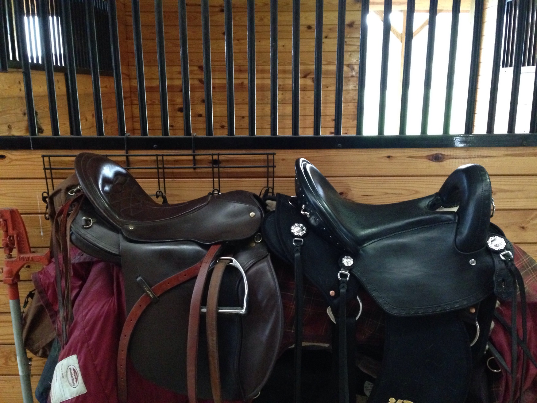Faygo in her new saddle… notice the bare back hoof- we’ve lost ANOTHER hoof boot. That’s three in a month now!Brown Campbell Saddle and Black (new) Phoenix Rising Saddle next to each other