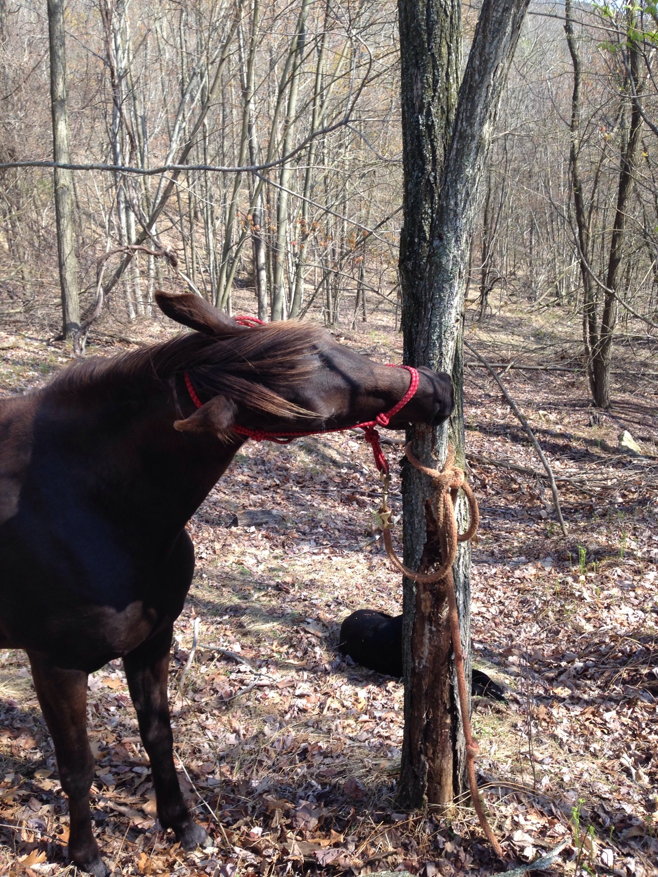 I am writing this while getting a little fresh air and exercise heading back up the mountain. Hm, this is my second walk. First I went to get the girls from their field to realize I only had one halter. In retracing my steps I had to go all the way up to a step outside the tack room to find the dropped rope halter- then go back down to pick up the horses. Right now- I’m going to collect Faygo who is tied to a tree at our main logging road. I’m sure she’s getting anxious I can hear her calling us. Why would I leave my horse tied to a tree and walk back down the mountain? In search of my other horse no doubt.