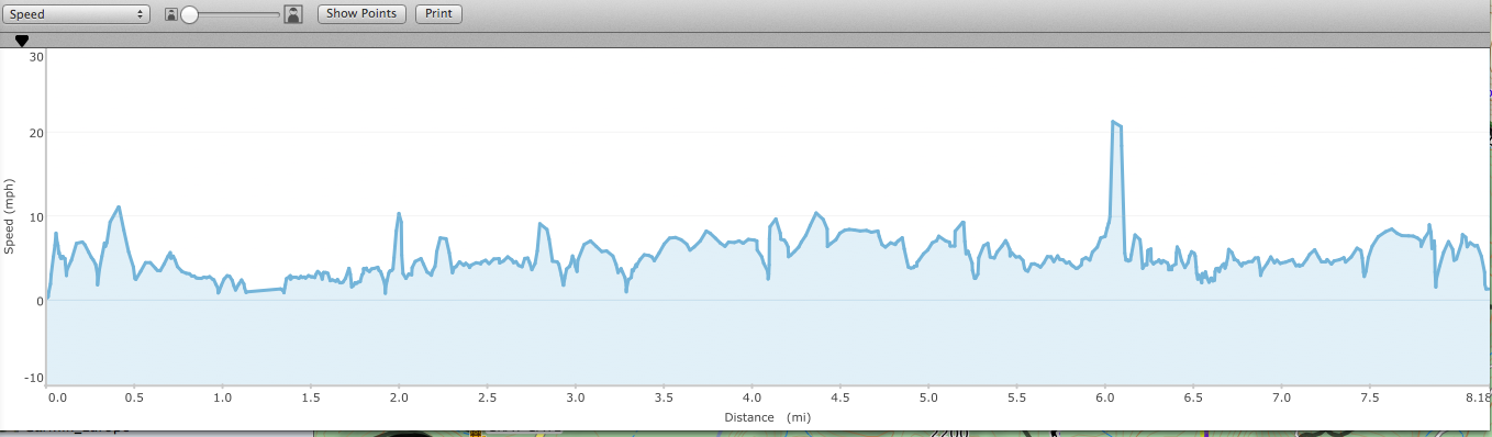 So what I’d like to start seeing on my GPS graphics is a decrease in those peaks and to begin to have a more stable average speed in our training. That is the goal as much as it’s possible to do so (terrain dictates much of our options).